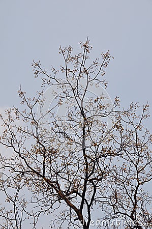 Birds in winter tree which is without leaves but seeds under blue sky.