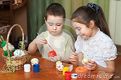 Brother and sister painted Easter eggs at the table