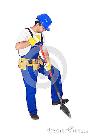 tool industry craft equipment smile work looking gloves shovel protective belt gear construction hat builder profession safety honest labour harworking job shoveler manual power protection caucasian professional worker hardhat uniform isolated helmet proud build