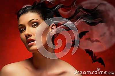 female danger gothic person dark seasonal mystery smoke beautiful caucasian scary woman moon beauty ghost devil attractive demon cruel evil vampire horror bat fear night style witch holiday one eyes adult wicked hair mysterious fantasy halloween girl young