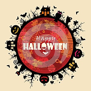 frame round pumpkin illustration holiday traditional artistic circle spooky haunted red beige grass texture background orange treat cat backdrop copyspace trick bat border spiders scary flying fall autumn vector celebration festive abstract ghosts house design seasonal retro stains horror graphic october curly foliage jack grunge lantern trees composition web black creepy silhouette halloween