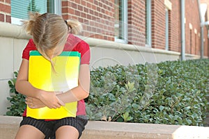 elementary sitting female wall sad cry school kid kids fear bully suffering crossed building anxiety education help alone bullied arms girl depressed child