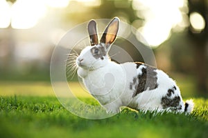 up pet small grass park focus selective shallow blur outdoors photo dof beautiful portrait white easter day outside copyspace bunny one animal rabbit closeup bokeh cute green nature close horizontal