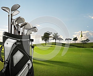 sky, green, course, sport ,sunset ,bag ,driver ,equipment ,outdoor, hole ,grass ,golf ,trees, flag