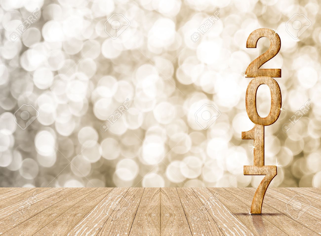 Stock Photo - 2017 year wood number in perspective room with sparkling bokeh wall and wooden plank floor,leave space for display of product.