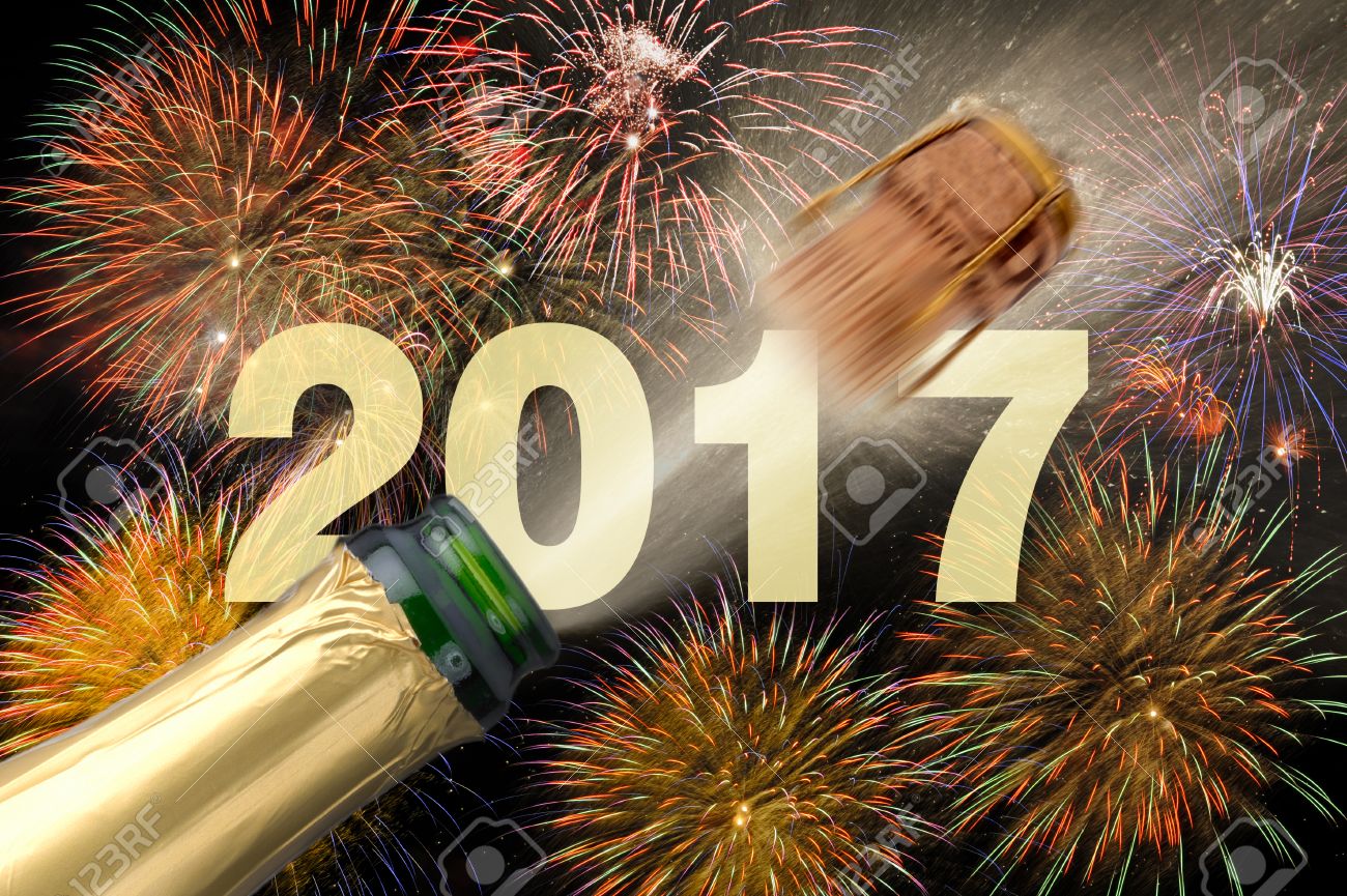 Stock Photo - popping champagne and fireworks at new years eve 2017