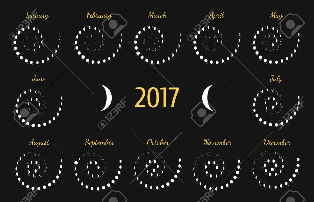 Vector - astrological spiral calendar for 2017. Lunye phase calendar for white on a dark grey background. Creative lunar calendar ideas for your design