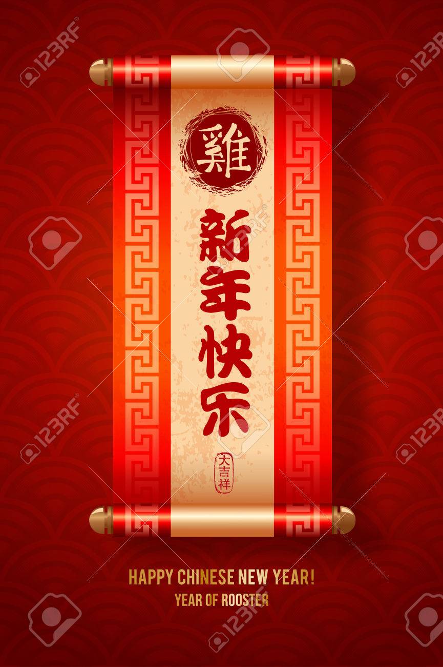 Vector - Chinese New Year festive vector card with scroll and chinese calligraphy (Chinese Translation: Happy New Year, rooster, on stamp : wishes of good luck). Seigaiha pattern on background.
