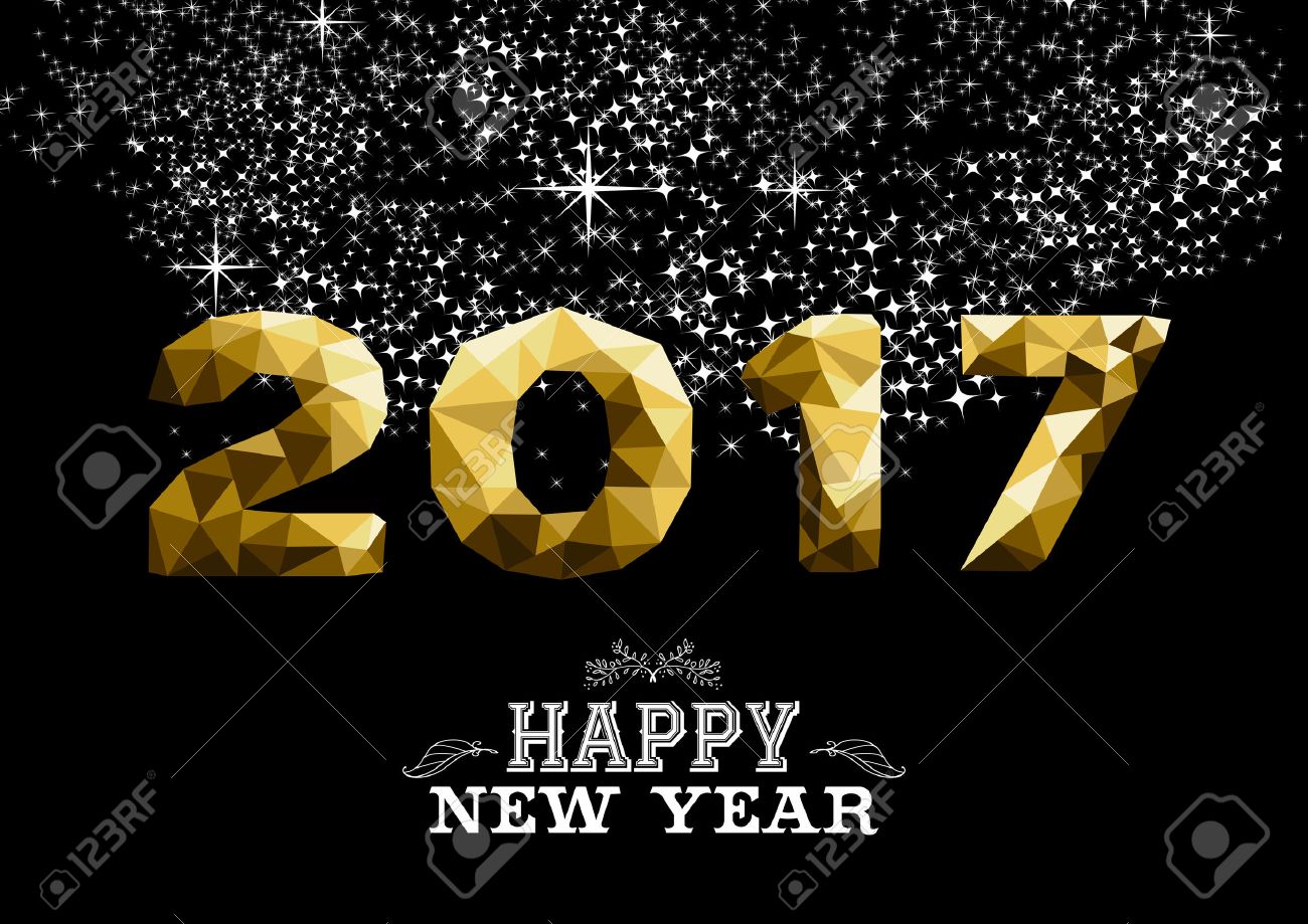 Vector - Happy new year 2017 gold low poly geometry design on night firework background. Ideal for greeting card, party invitation or web. vector.
