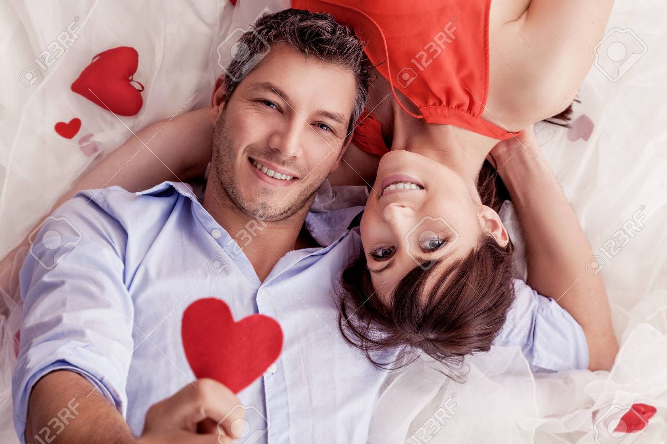 Stock Photo - smiling rose bed lying lovers