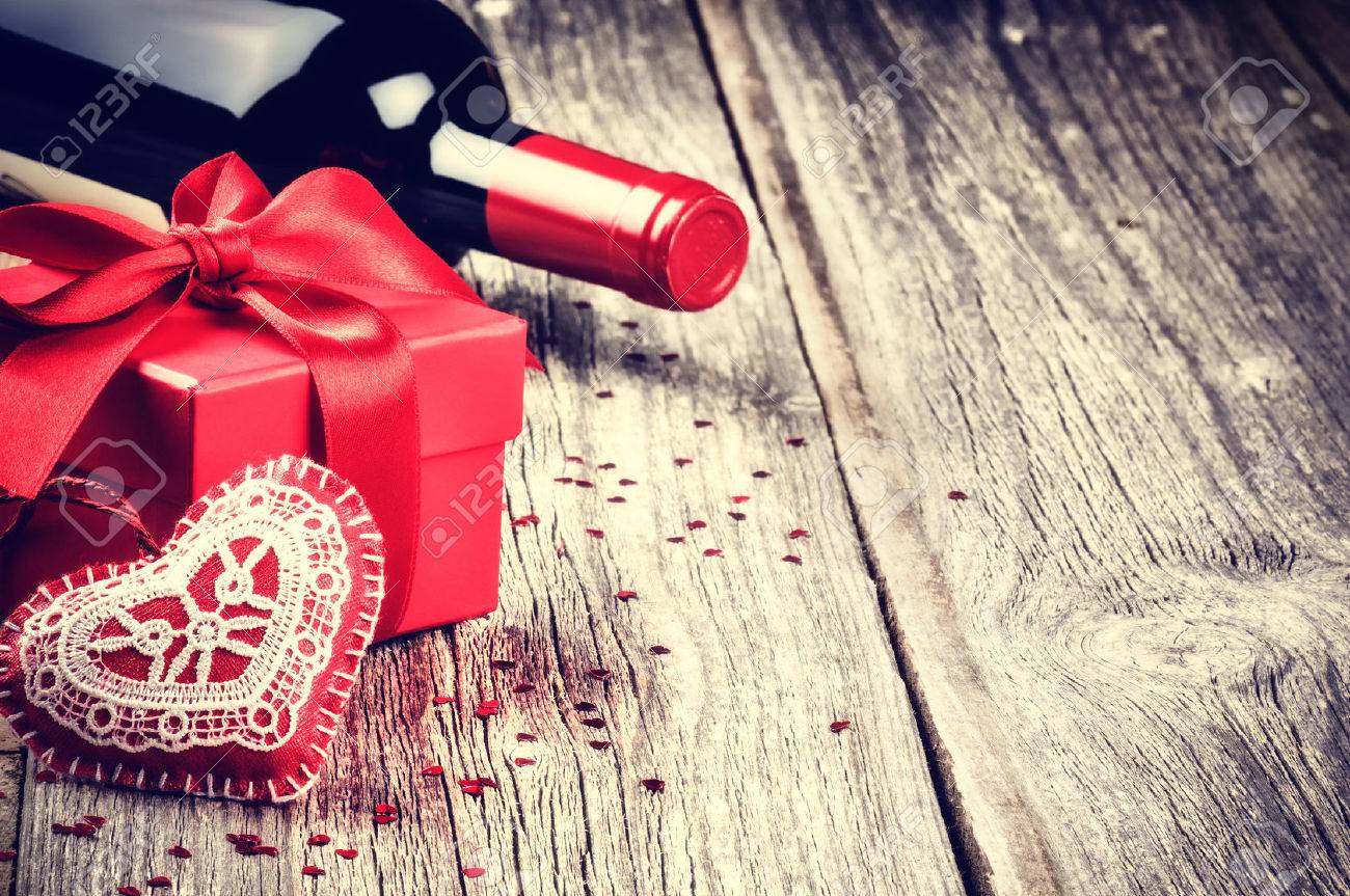 Stock Photo - St Valentine's setting with present and red wine on wooden background