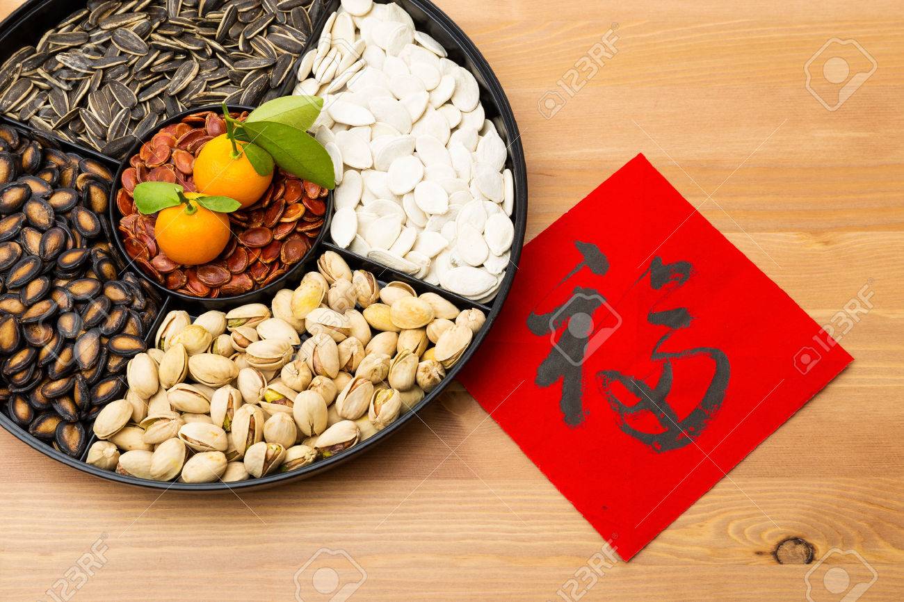 assorted, baked, banner, black, blessing, box, calligraphy, celebration, chinese, citrus, culture, dry, food, fruit, fu, good, ink, kumquat, leaf, leave, luck, lunar, melon, new, pistachio, plant, pumpkin, red, roasted, salty, seed, shelled, snack, style, sunflower, table, tangerine, traditional, tray, watermelon, wood, wooden, year