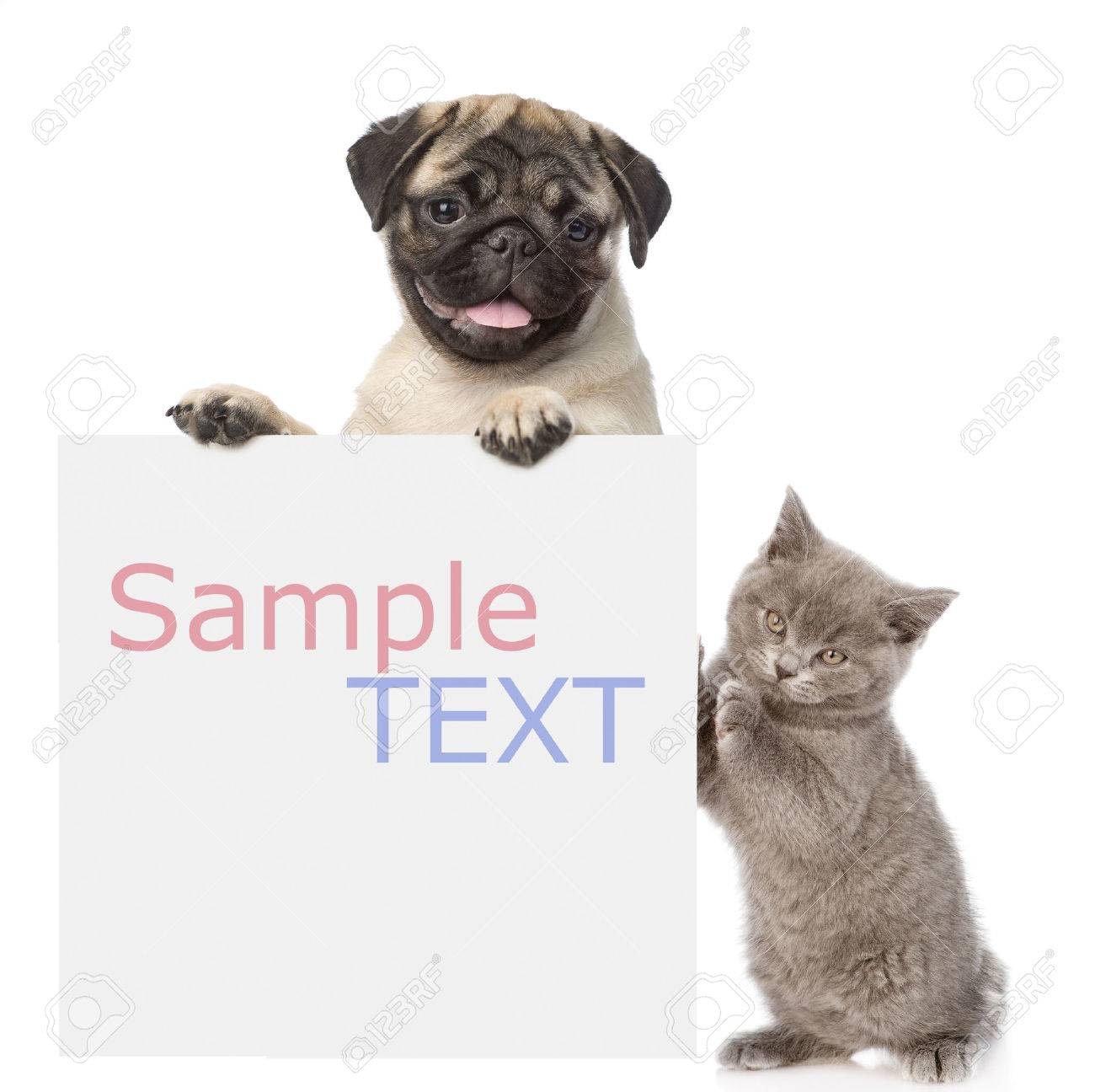above, animal, baby, background, banner, behind, blank, board, card, cardboard, care, cat, claws, concept, copy space, copyspace, cute, dog, domestic, empty, friendship, funny, isolated, kitten, laterally, looking at camera, message, muzzle, paper, paw, pedigreed, peeking, pet, placard, playing, portrait, poster, pug, puppy, sale, sample text, showing, sign, signboard, small, studio, together, white, whiteboard, young