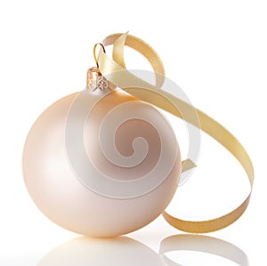 Traditional golden Christmas ball with a curly ribbon