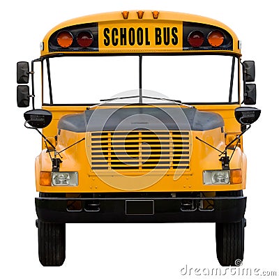 Yellow school bus isolated on white - front view with isolated windshield area