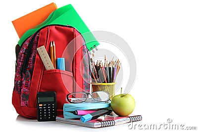 Pencil case with folders and school supplies in a red backpack on a white isolated background